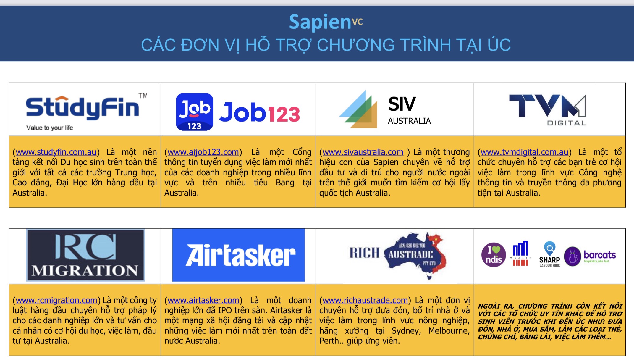 Các đơn vị hỗ trợ chương trình tại Australia Người đăng: Sapien Pathway - 20/03/2024 Chia sẻ: Tin tức liên quan Các đơn vị hỗ trợ chương trình tại Australia