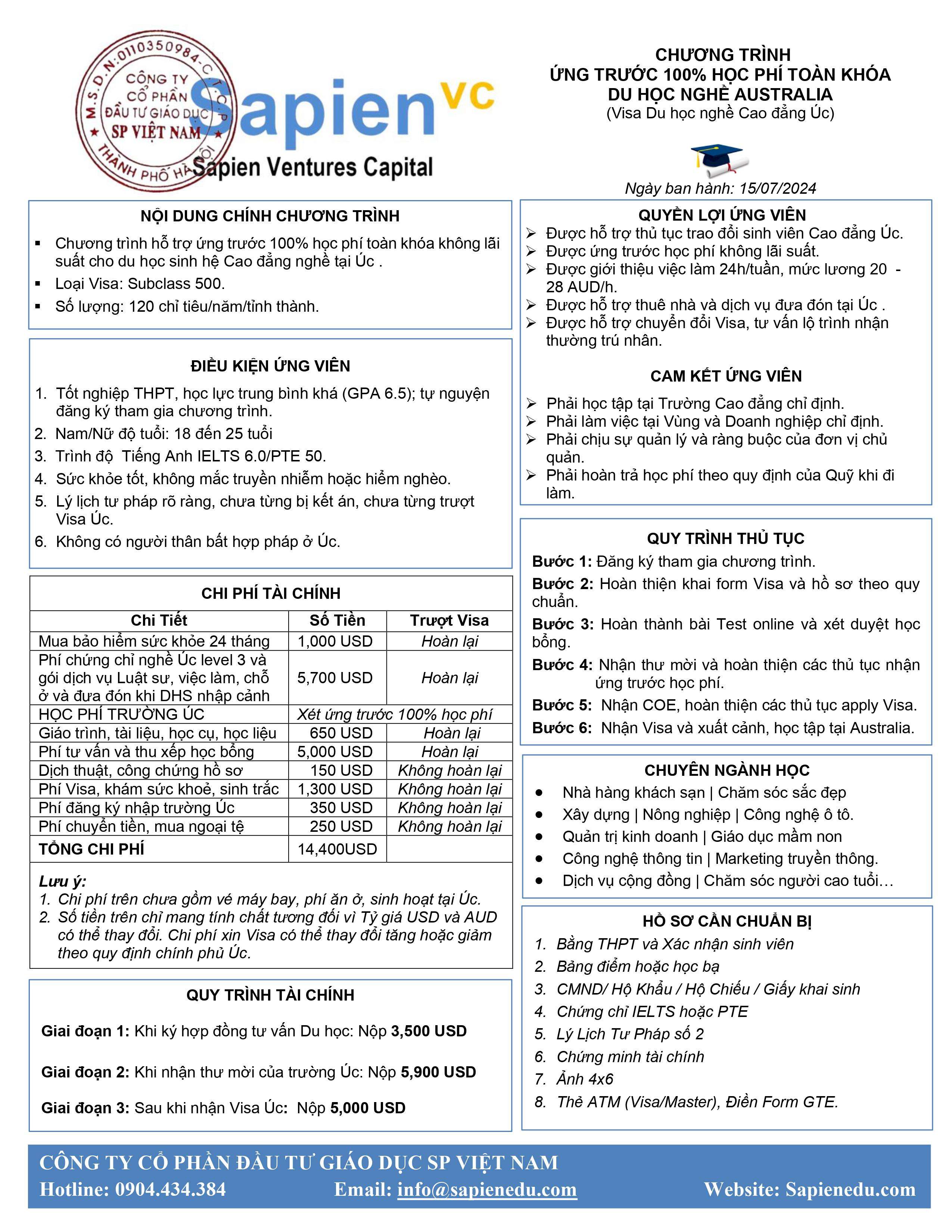 Chương trình du học nghề hệ cao đẳng với Sapien Pathway: Đây là chương trình mang lại lợi ích kép cho các bạn trẻ với cơ hội được đào tạo, cấp bằng Quốc tế ở một quốc gia có nên giáo dục tiên tiến, đồng thời được làm việc, tạo nguồn thu nhập đủ đáp ứng nhu cầu sinh hoạt, chi trả học phí tại Úc, thậm chí có tích lũy nếu chăm chỉ làm việc. Điều đặc biệt của chương trình là chúng tôi tài trợ ứng trước 100% học phí toàn khóa học không lãi suất, đồng thời sắp xếp lịch học tập, làm việc tối ưu cho du học sinh với 2 ngày học - 5 ngày đi làm trong 1 tuần với mức lương 20 – 28 AUD/h tùy theo trình độ tiếng Anh và kinh nghiệm làm việc của các bạn.